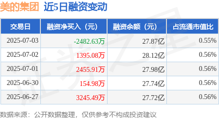 本站消息,7月3日,美的集团(000333)融资买入7587.61万元,融资偿还1.01亿元,融资净卖出2482.63万元,融资余额27.87亿元,近20个交易日中有12个交易日出现融资净买入。